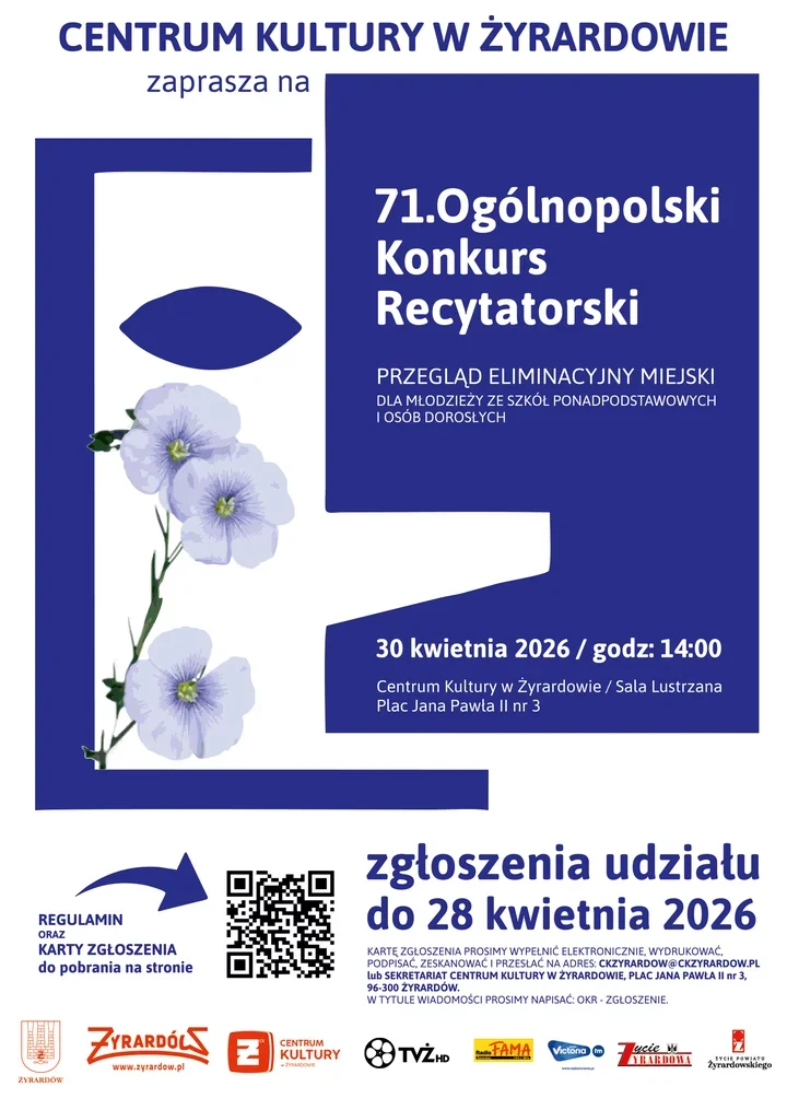 Do Centrum Kultury w Żyrardowie wraca scena, na której liczy się nie dekoracja, tylko głos, rytm i to, co zostaje między wersami. Miejski przegląd eliminacyjny 71. Ogólnopolskiego Konkursu Recytatorskiego daje szansę zarówno młodzieży ze szkół ponadpodstawowych, jak i dorosłym, którzy chcą sprawdzić się w słowie 🎤