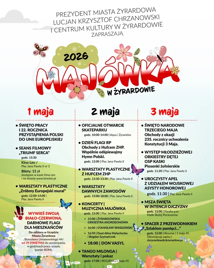 Żyrardów wchodzi w majówkę szeroko otwartą na mieszkańców - od warsztatów i koncertów, przez sportowe otwarcie, po uroczystości z biało-czerwonym akcentem. W programie są miejsca dobrze znane z miejskiego życia: Plac Jana Pawła II, Kino Len, Aqua Żyrardów i Resursa, więc każdy znajdzie tu coś dla siebie 🎨🇵🇱🎶